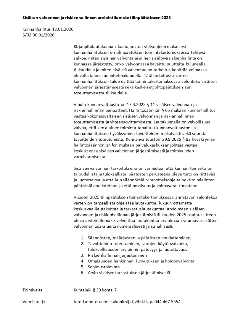 Liite 2 SISÄISEN VALVONNAN JA RISKIENHALLINNAN ARVIOINTILOMAKE 2025